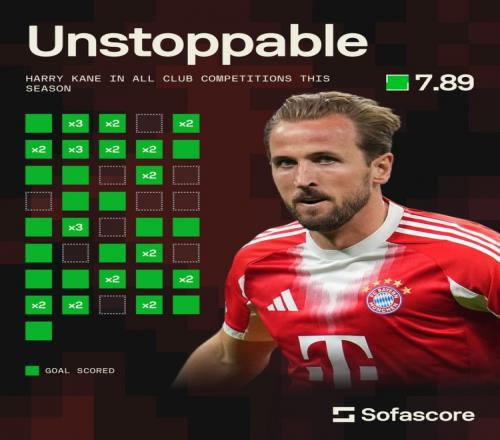 據(jù)Sofascore統(tǒng)計(jì),凱恩本賽季為拜仁出戰(zhàn)41場(chǎng)比賽,打進(jìn)49球,僅10場(chǎng)比賽未破門(mén),從未連續(xù)3場(chǎng)比賽無(wú)進(jìn)球。