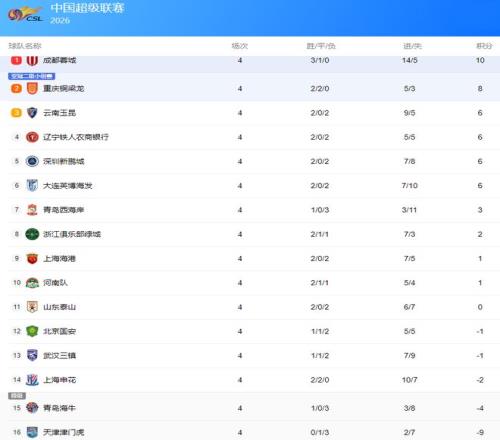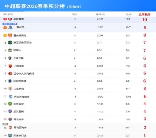 2026賽季中超聯(lián)賽前4輪戰(zhàn)罷,看著這個(gè)有提前扣分的積分榜(下圖),有的球隊(duì)歡喜,有的球迷悲傷。成都蓉城無疑是大贏家,前4輪3勝1平保持不敗,以10分高居中超積分榜榜首。升班馬重慶銅梁龍成為一匹黑馬,2勝2平同樣以不敗的戰(zhàn)績(jī)屈居積分榜第二。中超二年級(jí)生云南玉昆也表現(xiàn)搶眼,2勝2負(fù)積6分排在第三。