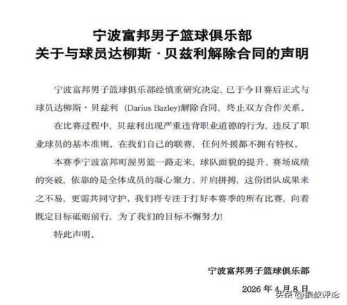 賽后,寧波男籃官方社媒直接發(fā)文,解雇貝茲利。