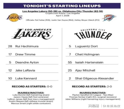 話說湖人主場迎戰(zhàn)雷霆,那雷霆可是衛(wèi)冕冠軍,氣勢洶洶如猛虎下山。而湖人呢,季后賽席位已經(jīng)穩(wěn)穩(wěn)當(dāng)當(dāng),干脆來了個“戰(zhàn)略性躺平”。賽前傷病報告一出,好家伙,阿king(詹姆斯)左腳“受傷”,需要“精心呵護(hù)”;東子和小里,一個左腿筋拉傷,一個左側(cè)腹斜肌拉傷,仿佛商量好了似的;斯瑪特右腳踝“不慎”挫傷,海斯左莫名”酸痛,都不打了。這傷病名單,簡直比劇本還精彩!