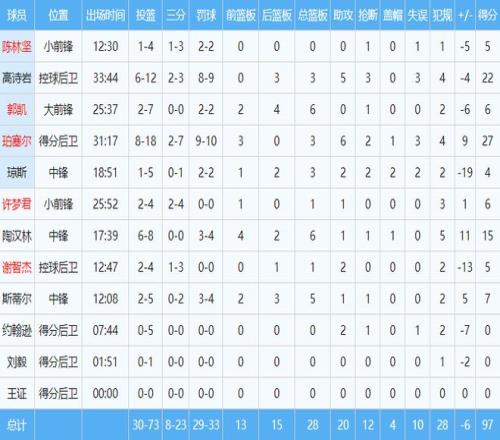 本場(chǎng)比賽,珀塞爾出場(chǎng)時(shí)間超過(guò)30分鐘,得到27分3籃板6助攻2搶斷。高詩(shī)巖找回進(jìn)攻感覺(jué),貢獻(xiàn)22分3籃板5助攻3搶斷。陶漢林得到15分6籃板,是山東隊(duì)在場(chǎng)效果最好的球員,正負(fù)值為15。其他球員沒(méi)有人得分上雙。約翰遜狀態(tài)奇差,5投0中一分未得。瓊斯打了19分鐘,僅得到4分,正負(fù)值為-19。斯蒂爾7分5籃板,末節(jié)被棄用。廣廈隊(duì)外援塔克砍下36分15籃板12助攻的大號(hào)三雙。