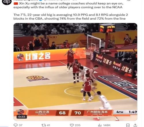 有美國(guó)媒體指出,有多所NCAA大學(xué)關(guān)注起了這位來(lái)自CBA的中鋒,稱贊徐昕有著不錯(cuò)的敏捷性和天賦。