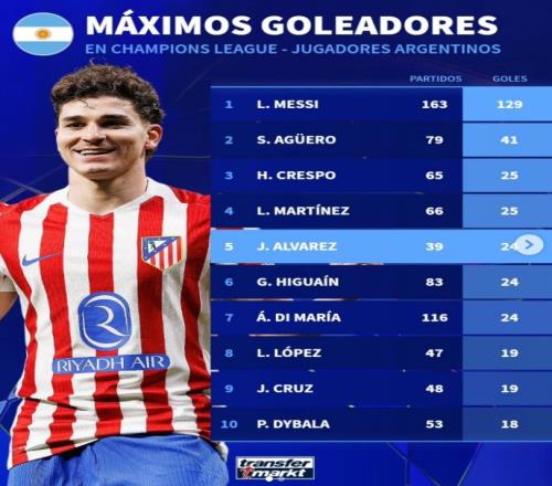 阿根廷球員歐冠進(jìn)球榜:梅西129球居首,阿爾瓦雷斯24球升第五