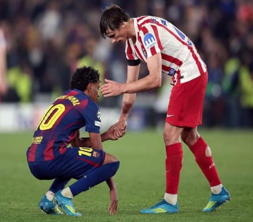 即便是馬競球員,也上前安慰傷心的亞馬爾。普比爾、穆索、勒諾爾芒……馬競球員紛紛上前,安慰亞馬爾。
