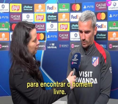 歐冠1/4決賽首回合,馬競(jìng)客場(chǎng)2-0戰(zhàn)勝巴薩,格列茲曼賽后接受了TNT體育巴西頻道的采訪。