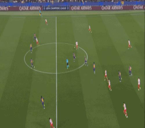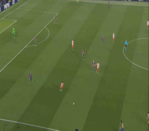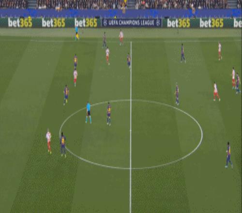 比賽第4分鐘,馬競在后場遭遇逼搶的時(shí)候,連續(xù)三次用斜傳完成了突破,這里就能看到巴塞羅那球員在逼搶中相對(duì)留力,沒有上身體和強(qiáng)度的痕跡了: