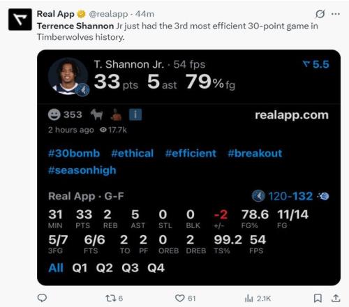 7.香農(nóng)也是森林狼隊史效率第三高拿到30+的球員;