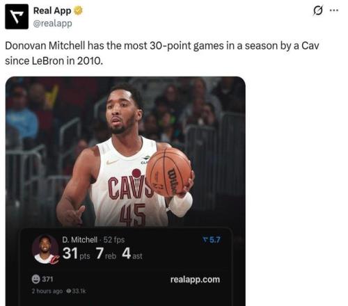 同時(shí)這是米切爾本賽季第34次砍下30+,成為騎士隊(duì)史自09-10賽季詹姆斯以來,單賽季砍下30+場次最多的球員。
