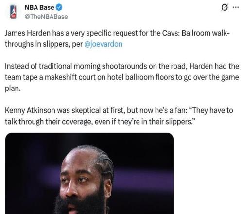 賽前美記Joe Vardon甚至曝出哈登在球隊(duì)客場征戰(zhàn)期間向騎士隊(duì)提出了一項(xiàng)非常具體的要求:在酒店宴會廳里穿著拖鞋進(jìn)行戰(zhàn)術(shù)演練。