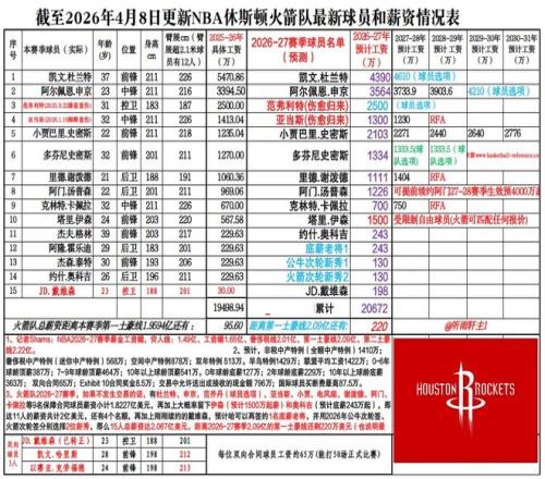 火箭還有2026年自己次輪、2026年公牛次輪可以選兩個(gè)新秀,這樣就14人了,轉(zhuǎn)正的戴維森會(huì)占據(jù)198萬的薪金空間,那么15人就湊齊了,綜合薪資2.067億距離第一土豪線還差220萬(注意這是不交易的情況下)。