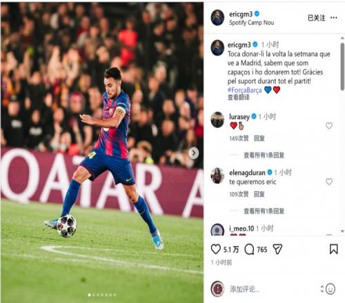 巴薩球員埃里克·加西亞社媒鼓勵(lì)球隊(duì),他寫道:“下周我們要在馬德里完成逆轉(zhuǎn),我們知道自己有這個(gè)能力,會(huì)拼盡全力!感謝球迷整場(chǎng)比賽的支持。”