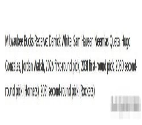 凱爾特人打包德里克·懷特、薩姆·豪瑟、奎塔、岡薩雷斯、喬丹·沃爾什,附加2026年和2031年的首輪選秀權(quán),以及黃蜂2030年和火箭2031年的次輪,開出一筆9換1的交易大方案。