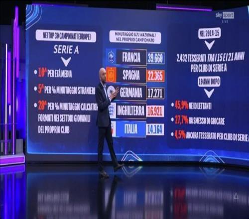 意大利從世預(yù)賽黯然出局后一周,歐冠八強(qiáng)戰(zhàn)首回合打響,皇馬和拜仁在伯納烏上演了90分鐘質(zhì)量極高的比賽,讓意大利人真實(shí)地看到了差距。幾個小時后,意大利足協(xié)發(fā)布了一份關(guān)于意大利足球的發(fā)展報告,天空體育在周三晚間的節(jié)目中以此為基礎(chǔ),進(jìn)行了一次精彩的技術(shù)分析,試圖用圖表和數(shù)據(jù)“診斷”意大利足球的病因。