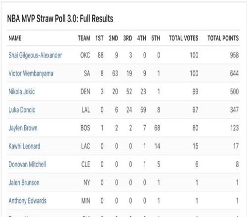 據(jù)ESPN最新一期MVP模擬投票統(tǒng)計,亞歷山大狂攬88張第一順位選票,總得分高達958分,以斷層優(yōu)勢領跑全聯(lián)盟。