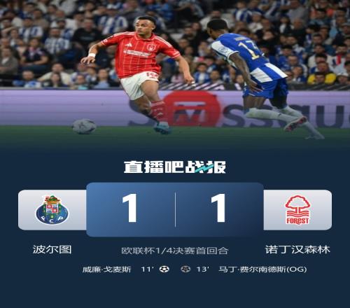 下半場傷停補(bǔ)時5分鐘,全場比賽結(jié)束,最終波爾圖1-1諾丁漢森林。