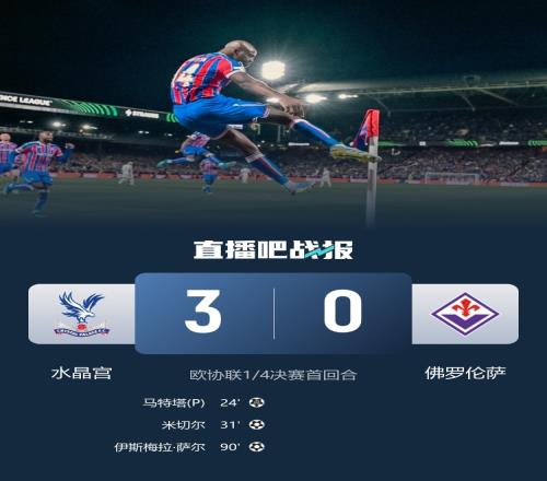 體育播報(bào)4月10日宣 北京時(shí)間4月10日3:00,歐協(xié)聯(lián)1/4決賽首回合,水晶宮在塞爾赫斯特公園球場(chǎng)迎戰(zhàn)佛羅倫薩。上半場(chǎng),蓋桑造點(diǎn),馬特塔點(diǎn)射打破僵局,隨后米切爾幫助水晶宮擴(kuò)大領(lǐng)先優(yōu)勢(shì);下半場(chǎng),佛羅倫薩加強(qiáng)進(jìn)攻卻始終未能改寫比分,薩爾終場(chǎng)前再下一城,最終水晶宮在主場(chǎng)3-0擊敗佛羅倫薩,兩隊(duì)次回合比賽將于4月17日3:00在弗蘭基球場(chǎng)進(jìn)行。