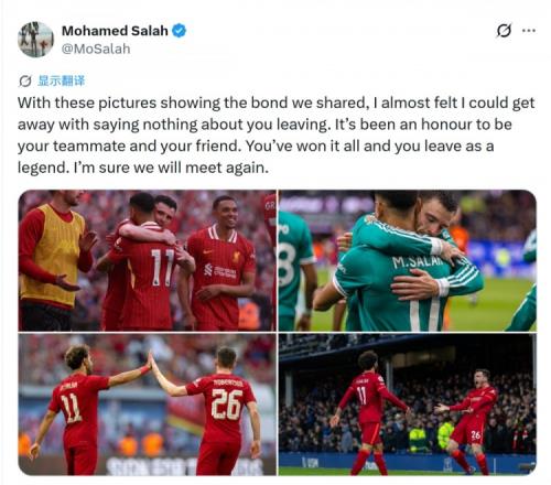 薩拉赫社媒曬出與羅伯遜的合照,配文:“看著這些記錄我們深厚情誼的照片,我甚至覺得即便對你的離隊(duì)只字不提也無妨。能成為你的隊(duì)友和朋友,是我的榮幸。你已贏得一切,并以傳奇之姿離去。我相信我們定會再次相逢?!?/p>