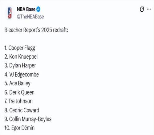 北京時間4月10日,2025-26賽季的常規(guī)賽接近尾聲,知名美媒Bleacher Report撰文重排2025年選秀。弗拉格仍是狀元,克努佩爾被放在榜眼的位置上,而中國球員楊瀚森則掉出首輪。以下是重排后的前10順位(括號內(nèi)為原順位)——