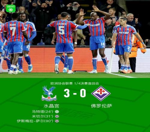 北京時(shí)間4月10日歐洲協(xié)會(huì)聯(lián)賽 1/4決賽首回合,水晶宮對(duì)陣佛羅倫薩。水晶宮馬特塔破門,米切爾破門,伊斯梅拉-薩爾破門。最終比分水晶宮 3-0 佛羅倫薩。