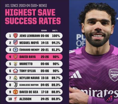 排在第一的是05-06賽季的萊曼,歐冠比賽撲救成功率100%!那個賽季阿森納在歐冠中一共只丟了4個球,其中2個還是決賽中萊曼被罰下之后被打進的……