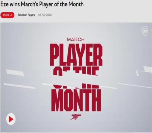 官方:阿森納宣布埃澤被評為了隊內3月份最佳球員,英格蘭人得到了球迷37%的投票,拉亞和賴斯分列二三位。