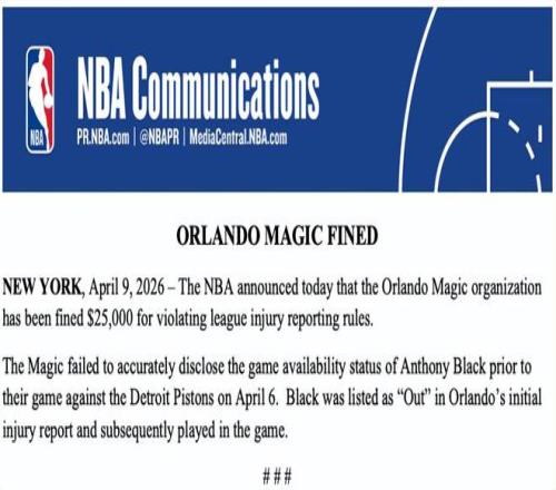 北京時間4月10日,NBA在今日官方聲明中宣布,奧蘭多魔術(shù)隊因違反聯(lián)盟傷病報告規(guī)定,被罰款25000美元。