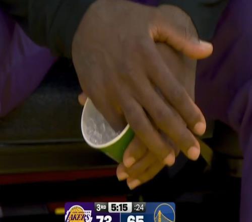 比賽第三節(jié),詹姆斯飛身追帽,右手小指受傷。隨后他返回場(chǎng)邊進(jìn)行冰敷治療,很快又再次登場(chǎng)。