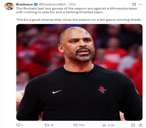 休媒繼續(xù)寫道:火箭本賽季余下的兩場比賽分別對陣一支毫無戰(zhàn)意的森林狼與一支擺爛的灰熊,火箭隊大概率會以10連勝的態(tài)勢結束本賽季。
