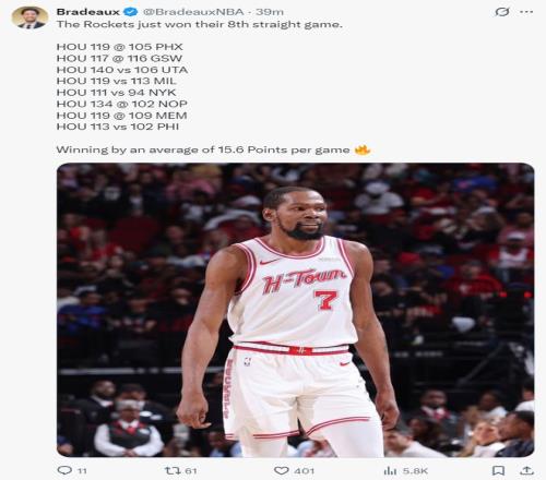 休媒Bradeaux曬出火箭這一波8連勝:火箭119-105太陽、火箭117-116勇士、火箭104-106爵士、火箭119-113雄鹿、火箭111-94尼克斯、火箭134-102鵜鶘、火箭119-109灰熊、火箭113-102費城?;鸺藞霰荣悆魟?25分
