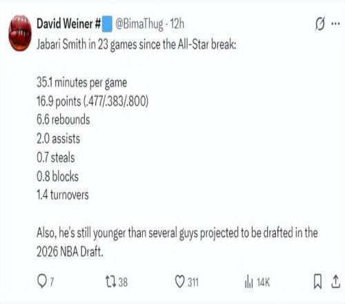但根據(jù)火箭記者大衛(wèi)-韋納的說法,火箭隊在全明星賽后蛻變最大的球員是小賈巴里-史密斯,他場均35.1分鐘,拿到16.9分6.6籃板2助攻0.7搶斷0.8蓋帽僅1.4失誤,命中率47.7%,三分命中率8.3%,他成為杜蘭特、申京、阿門外球隊的第四巨頭。