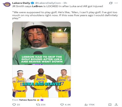 這場比賽之前,詹姆斯的密友JR-史密斯談到東契奇、里夫斯傷停后勒布朗的表現(xiàn),他說道:由于盧卡、奧斯汀受傷,勒布朗的表現(xiàn)已經(jīng)無可挑剔,我們原本是打算去打高爾夫球的,但勒布朗說他無法參與了,因為現(xiàn)在身上的擔(dān)子太重了,要是五年前我肯定會去打的。