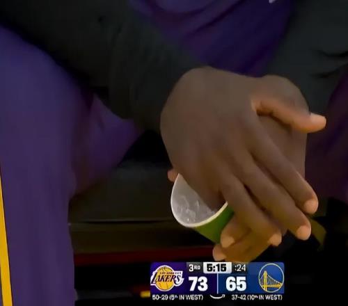 這場比賽的第三節(jié)勒布朗一次回防完成釘板大帽,但他這一球他的小手指打在了籃板上,勒布朗痛的不行,隨后他被換下場,但他沒有進入更衣室是用冰塊消腫止痛。