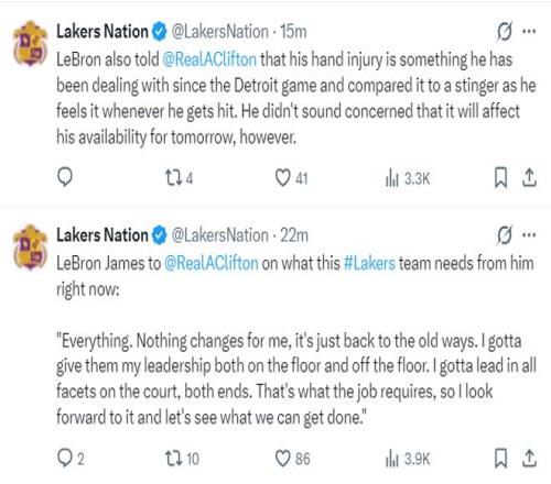 賽后勒布朗-詹姆斯談到傷勢,他表示自己的手部在對陣活塞后就有舊傷,這個傷勢一直困擾著自己,在這場比賽后有了‘針刺一般的疼痛’,不過并不用太擔(dān)心,不會影響他出戰(zhàn)背靠背對陣太陽的比賽。
