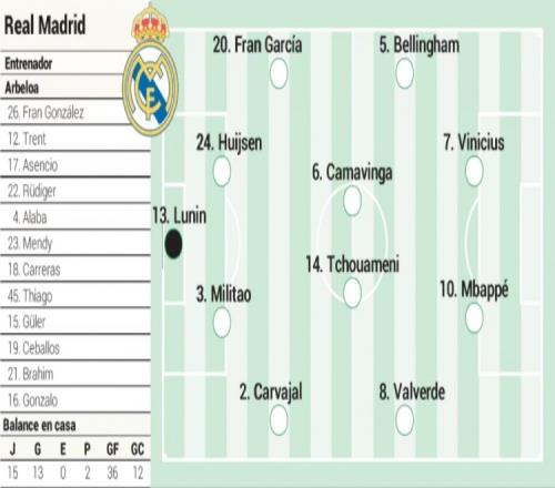 附阿斯預(yù)測皇馬首發(fā):13-盧寧、20-弗蘭·加西亞、24-赫伊森、3-米利唐、2-卡瓦哈爾、6-卡馬文加、14-瓊阿梅尼、5-貝林厄姆、8-巴爾韋德、7-維尼修斯、10-姆巴佩
