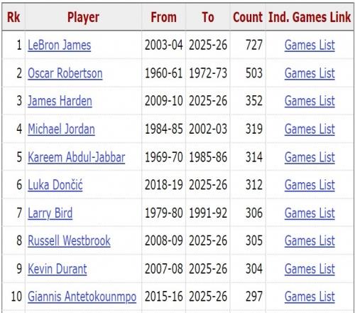 目前排在KD和威少前面一位的是拉里·伯德,306場25+5+5。