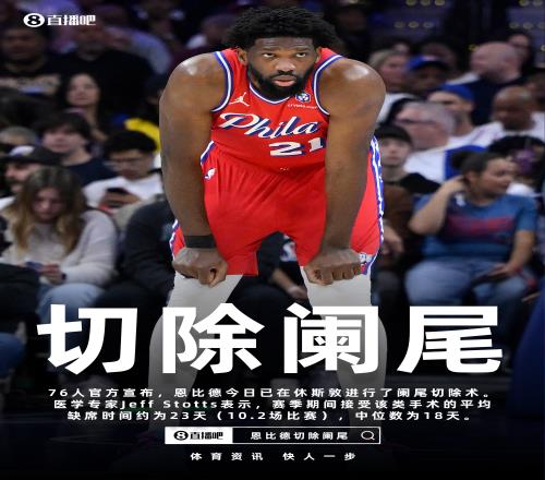 76人官宣恩比德已進(jìn)行闌尾切除術(shù)專家:賽季期間平均缺陣約23天