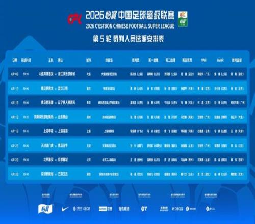 4月10日至12日,2026賽季中超聯(lián)賽展開第5輪角逐。賽前,中國(guó)足協(xié)發(fā)布了本輪裁判人員選派安排表。本輪8名主裁判中,有6人迎來中超首秀或賽季首秀,只有2位是熟面孔。