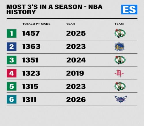 球隊(duì)單季三分命中數(shù)紀(jì)錄!綠軍上賽季1457記最多本賽季黃蜂排第6 Instagram 2026-04-10 20:39:50 籃球勇士凱爾特人NBA火箭黃蜂公牛獨(dú)行俠森林狼 上一篇: 50勝球隊(duì)單賽季經(jīng)歷至少10場(chǎng)20+分差慘?。簹v史僅有最近兩季湖人下一篇: 帕森斯:哈登季后賽沒(méi)有太多成功經(jīng)驗(yàn)希望看他和騎士能有突破