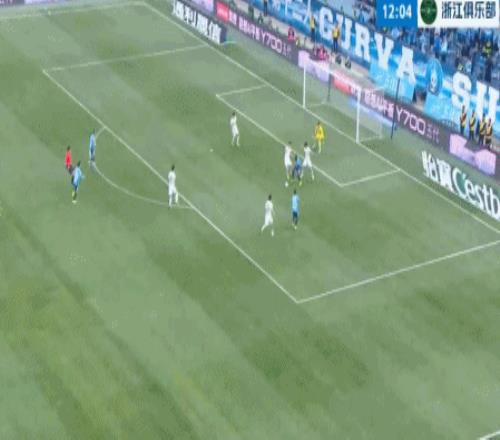 第13分鐘,阿奇姆彭禁區(qū)內(nèi)回做,無(wú)人盯防的馮勁勁射擊中橫梁。隨后,馮勁禁區(qū)前直塞,阿奇姆彭突入禁區(qū)小角度勁射擊中邊網(wǎng)。