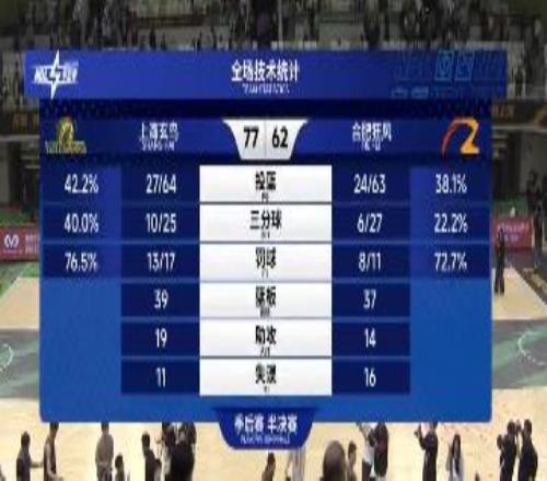 手握賽點的上海玄鳥隊開場便破釜沉舟,客場作戰(zhàn)的合肥狂風隊為延續(xù)希望同樣打得極為強硬。比賽如預期般高強度對抗:首節(jié)玄鳥20比15領先,次節(jié)狂風16比10回敬,半場結束,玄鳥以30比31落后。好在下半場,上海玄鳥在外援拉維特的帶領下逐漸拉開了比分,尤其是第四節(jié)打出了23比13的小高潮,最終在在主場球迷的歡呼聲中以77比62拿下這場關鍵勝利。