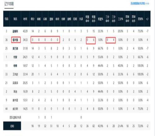 本場(chǎng)比賽,遼寧有10人上場(chǎng),9人得分,其中6人得分上雙,唯一名隊(duì)員不得分,打了34分鐘幾乎所有數(shù)據(jù)欄都掛0,真是糟糕透頂。沒錯(cuò),這位隊(duì)員就是首發(fā)的鄢手騏,他打了全隊(duì)第二多時(shí)間,卻交出慘不忍睹的數(shù)據(jù),全場(chǎng)6投0中,一分不得,不但不得分,還0板0助,還有2個(gè)失誤和4次犯規(guī),這樣的控衛(wèi)也實(shí)在太差了,如果這場(chǎng)比賽不讓他打這么多時(shí)間,也許勝利就在遼寧隊(duì)一邊。