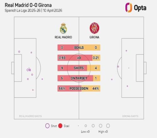 此役主場對陣赫羅納,皇家馬德里在上半場完成9次射門,其中5次射正,但未能轉(zhuǎn)化為進(jìn)球。