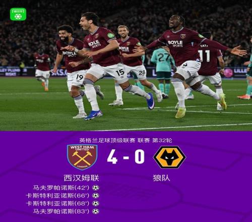 北京時(shí)間4月11日英格蘭足球頂級(jí)聯(lián)賽 聯(lián)賽 第32輪,西漢姆聯(lián)主場(chǎng)對(duì)陣?yán)顷?duì)。西漢姆聯(lián)馬夫羅帕諾斯梅開二度,卡斯特利亞諾斯梅開二度。最終比分西漢姆聯(lián) 4-0 狼隊(duì)。