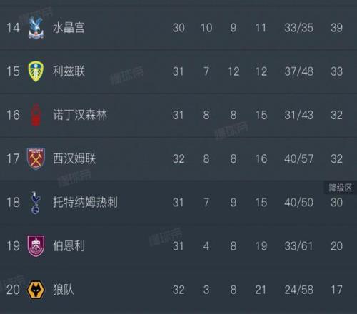 西漢姆聯(lián)先賽一場,32輪積分達(dá)到32分追平諾丁漢森林,位列英超第17,熱刺31輪積30分,排名跌至第18,進(jìn)入到了英超降級區(qū)!