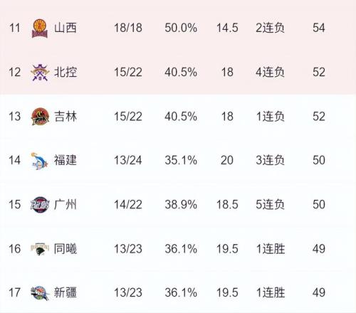目前常規(guī)賽第12名到第17名的排名和戰(zhàn)績(jī)分別是:北控男籃和吉林男籃的15勝22負(fù)、福建男籃的13勝24負(fù);廣州男籃的14勝22負(fù)(少賽一場(chǎng))、南京男籃和新疆男籃的13勝23負(fù)(少賽一場(chǎng));在常規(guī)賽還剩下5-6場(chǎng)的情況下,這六支球隊(duì)均具備沖擊季后賽附加賽的可能性。