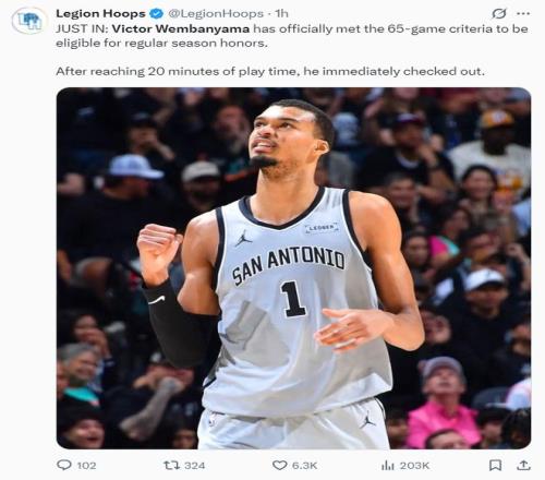 26分鐘40+13達(dá)成評獎場次!文班DPOY概率超99%美媒挺MVP+DPOY