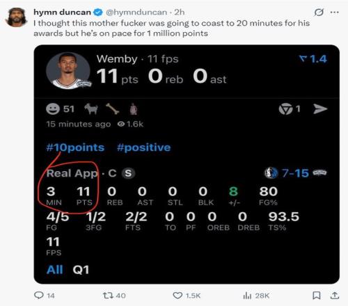 全場比賽文班亞馬26分鐘,23中14,三分7中2,罰球11中10,拿到40分13籃板5助攻1搶斷2蓋帽0犯規(guī)2失誤,命中率60.9%,三分命中率28.6%,真實命中率71.2%,正負(fù)值+10。文班亞馬在登場時間被切的很碎的情況下再度打出完美數(shù)據(jù)。