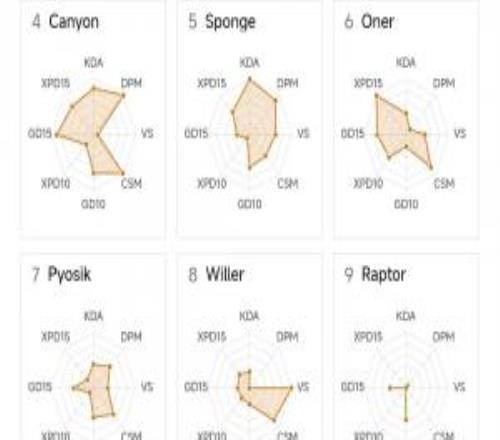 電競(jìng)體育4月11報(bào)道 近日,有國(guó)外粉絲制作了4月10日前LCK聯(lián)賽的選手?jǐn)?shù)據(jù)雷達(dá)圖,其中打野位置里數(shù)據(jù)最亮眼的是BRO的打野GIDEON與Cuzz,而B(niǎo)FX打野Raptor的雷達(dá)圖則成了“時(shí)鐘圖”!