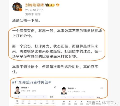 然而,杜鋒的這番話,卻遭到了CBA記者“別跑剛背豬”的質(zhì)疑,他認(rèn)為杜鋒在用人方面,有大問題,受傷的球員,打得一般,效率不高的張皓嘉,在場(chǎng)上打了15分鐘。反觀,沒有傷病,而且,打球十分努力,狀態(tài)也是十分不錯(cuò)的陳家政,卻只打了10分鐘,這樣的情況,明顯是存在問題。