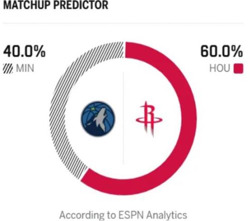 火箭這邊,上一場擊敗76人,斬獲八連勝,以51勝29負(fù)的戰(zhàn)績排在西部第五。賽季末段火箭及時回暖,上一場面對76人,雖然一度被對手縮小分差,最終還是有驚無險拿下勝利。杜蘭特全場砍下29分7籃板5助攻,末節(jié)用一記關(guān)鍵三分鎖定勝局,阿門和小史密斯各拿到19分,申京手感不佳14投4中,僅得到8分12籃板。范弗里特和亞當(dāng)斯因傷無法出戰(zhàn)?;鸺跔顟B(tài)火熱,即便上一場領(lǐng)先優(yōu)勢被反撲,前三節(jié)的表現(xiàn)依舊亮眼;森林狼上一場的大規(guī)模輪休也能看出球隊對戰(zhàn)績不再執(zhí)著,而火箭還需要更多勝利沖擊更好的排名,兩隊的戰(zhàn)意有著明顯差距。ESPN預(yù)測明日比賽:火箭勝率60.0%,森林狼勝率40.0%。